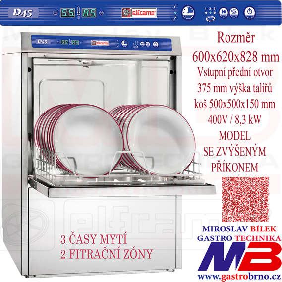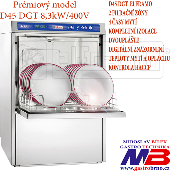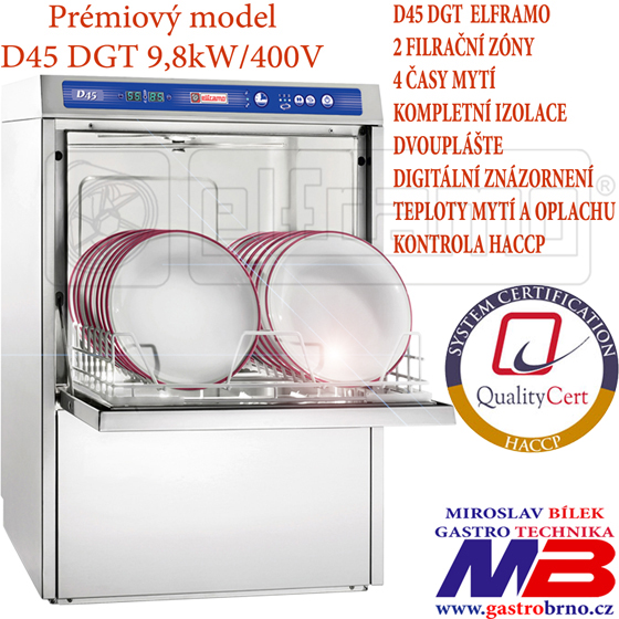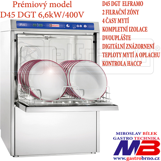 Nejžádanější profi myčka nádobí a skla D 45 DGT ELFRAMO® s příkonem 8,3kW 400 V s digitálním programátorem bez výpustného čerpadla na odpadní vodu od výrobce ELFRAMO®. Splňuje standardy HACCP.